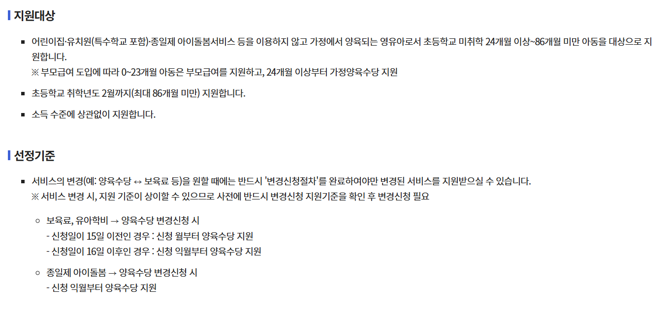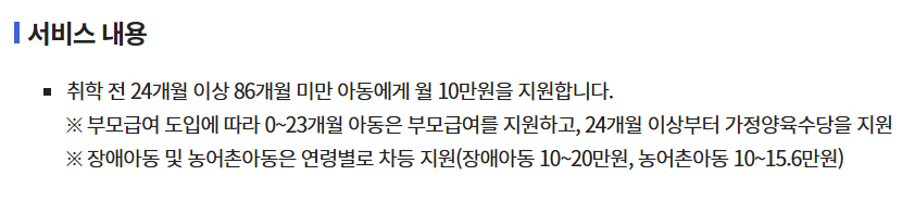 - 대상: 어린이집·유치원·아이돌봄서비스 등 이용하지 않고 집에서 양육하는 24개월~86개월 미만(초등학교 입학 전)의 미취학 아동
