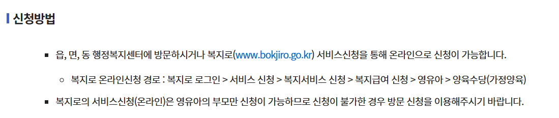 - 온라인: 복지로 로그인 → 복지서비스 신청 → 복지급여 신청 → 영유아 → 가정양육수당 선택