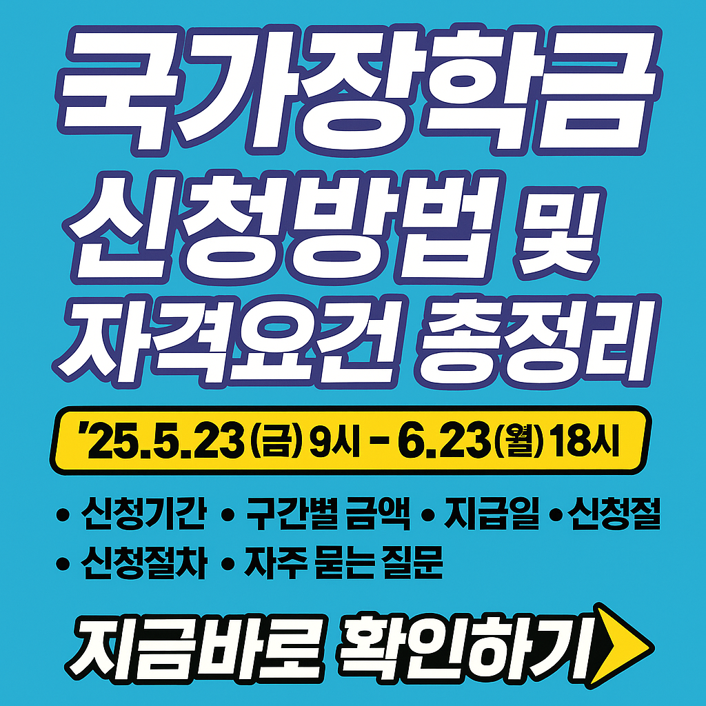 - 국가장학금 신청기간: 2025년 5월 23일(금) 오전 9시 ~ 6월 23일(월) 오후 6시