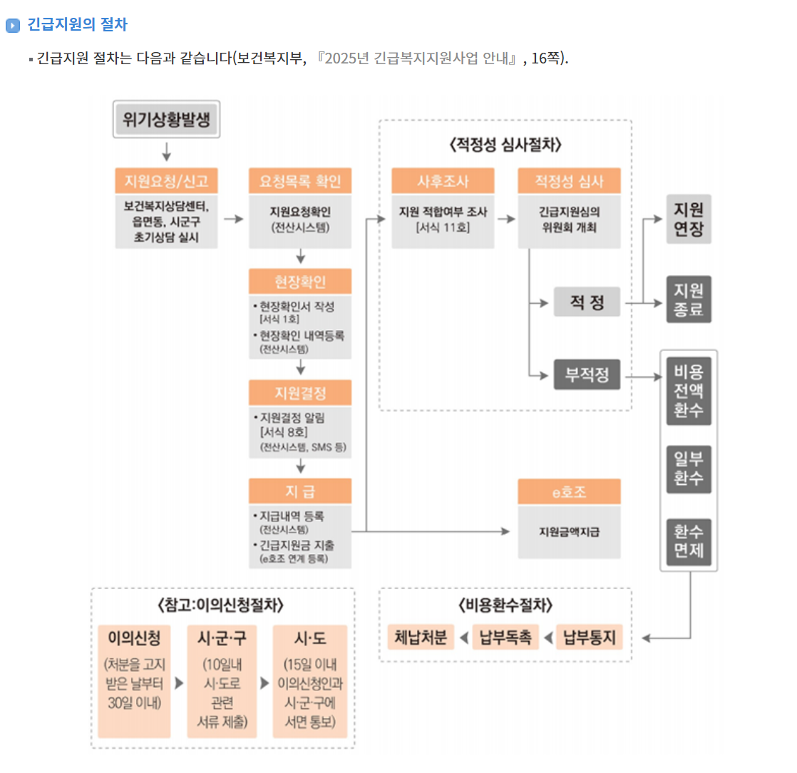 - 사후 심사: 긴급지원심의위원회에서 적정성 심사, 부적격 시 환수.