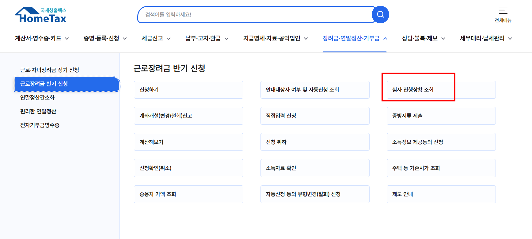 - 로그인 후 "장려금·연말정산·전자기부금" → "근로장려금 정기/반기 신청" → "심사진행상황 조회" 클릭.
