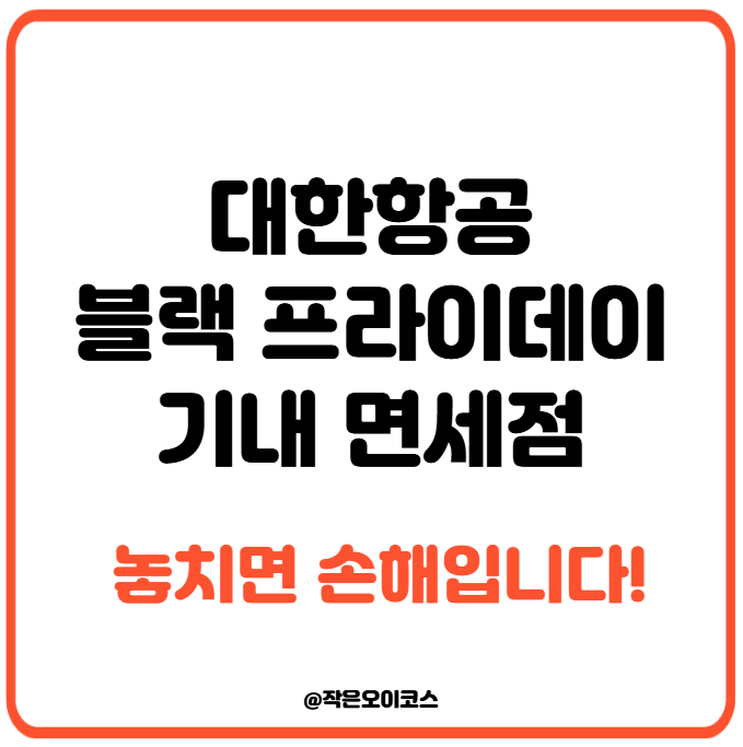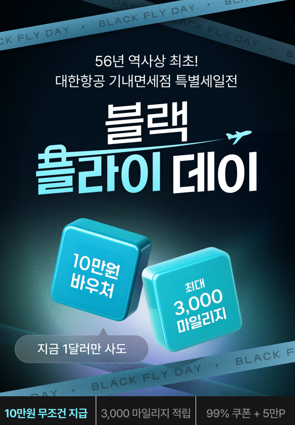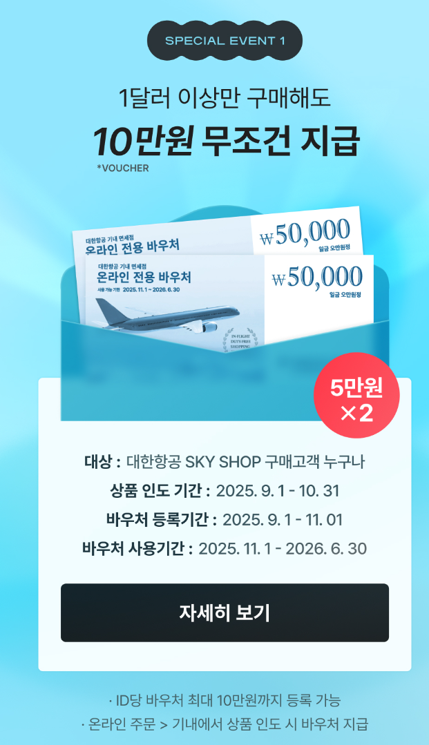 대한항공 기내 면세점 스카이샵이 ‘블랙 플라이 데이’ 이벤트를 열었습니다. 1달러만 써도 5만 원 할인권 2장(총 10만 원)을 받을 수 있고, 조건 충족 시 대한항공 마일리지도 추가 적립됩니다.
