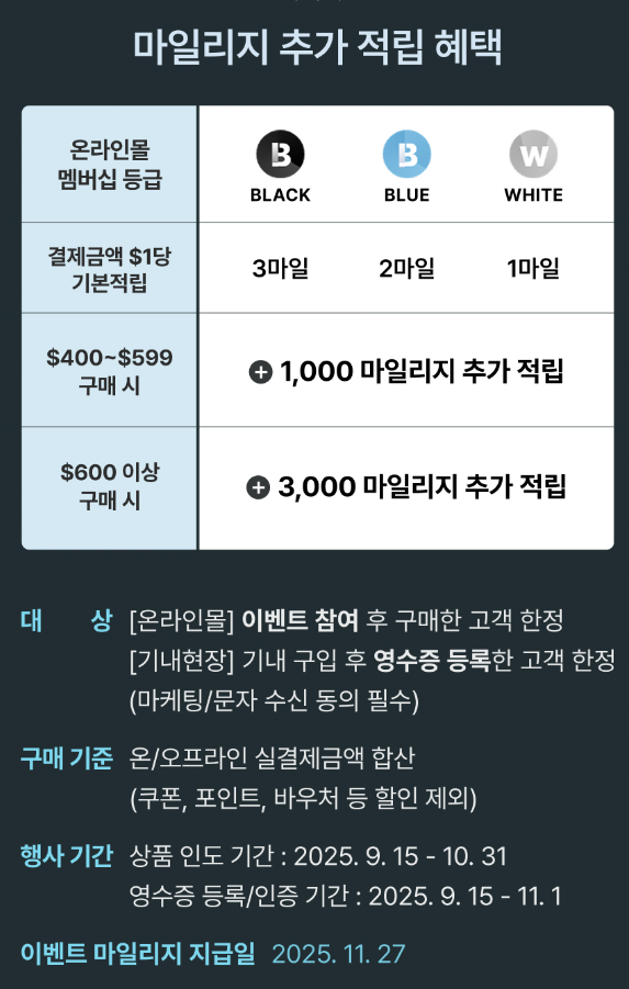 - 9월 15일 ~ 10월 31일 사이 결제 영수증 업로드 시, 마일리지 추가 반영