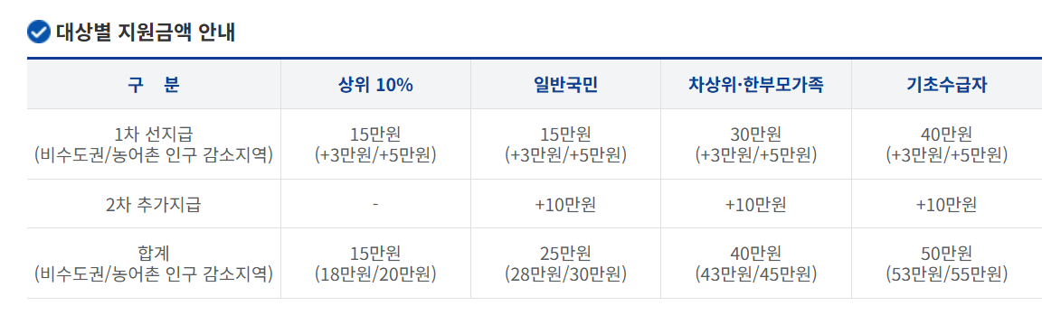 - 기준: 가구 소득·재산 수준, 가구원 수 기준으로 선별 지급