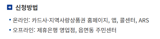 - 온라인: 전용 홈페이지 접속 → 본인 인증 (휴대폰·아이핀 등) → 카드 정보 또는 지역화폐 계좌 입력 → 신청 완료