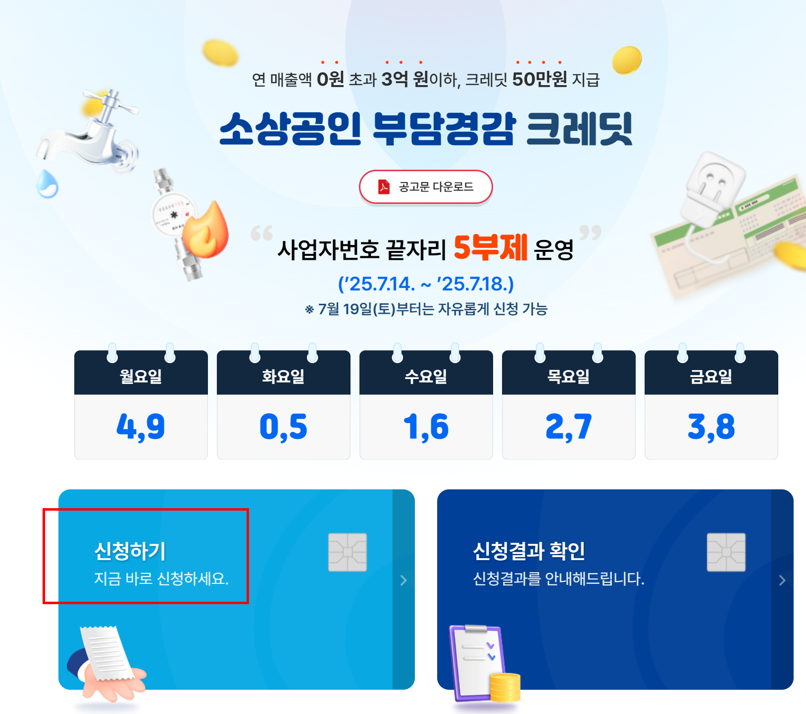 신청 초기에는 사업자등록번호 끝자리 기준 5부제 신청을 진행하고 있습니다.