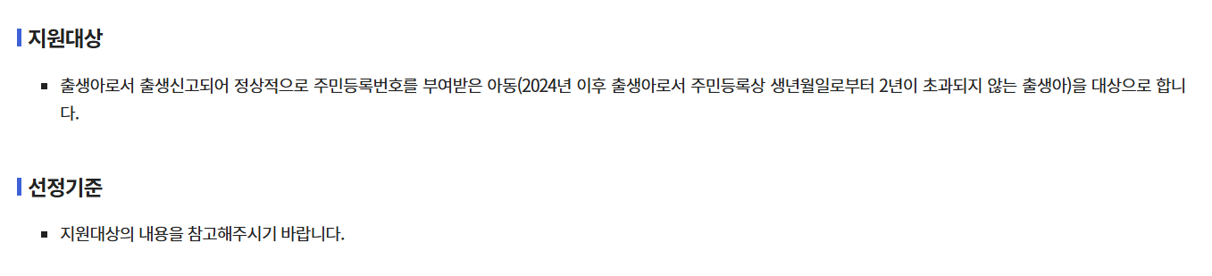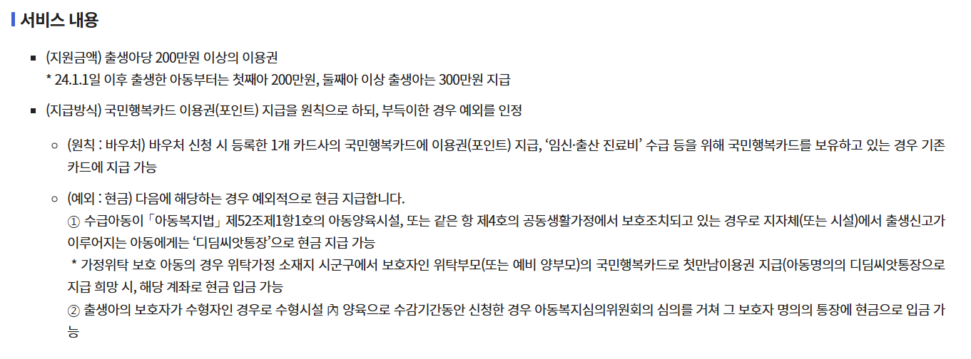 - 출산 후 '첫만남 이용권'으로 첫째 200만 원, 둘째 이상 300만 원 지원