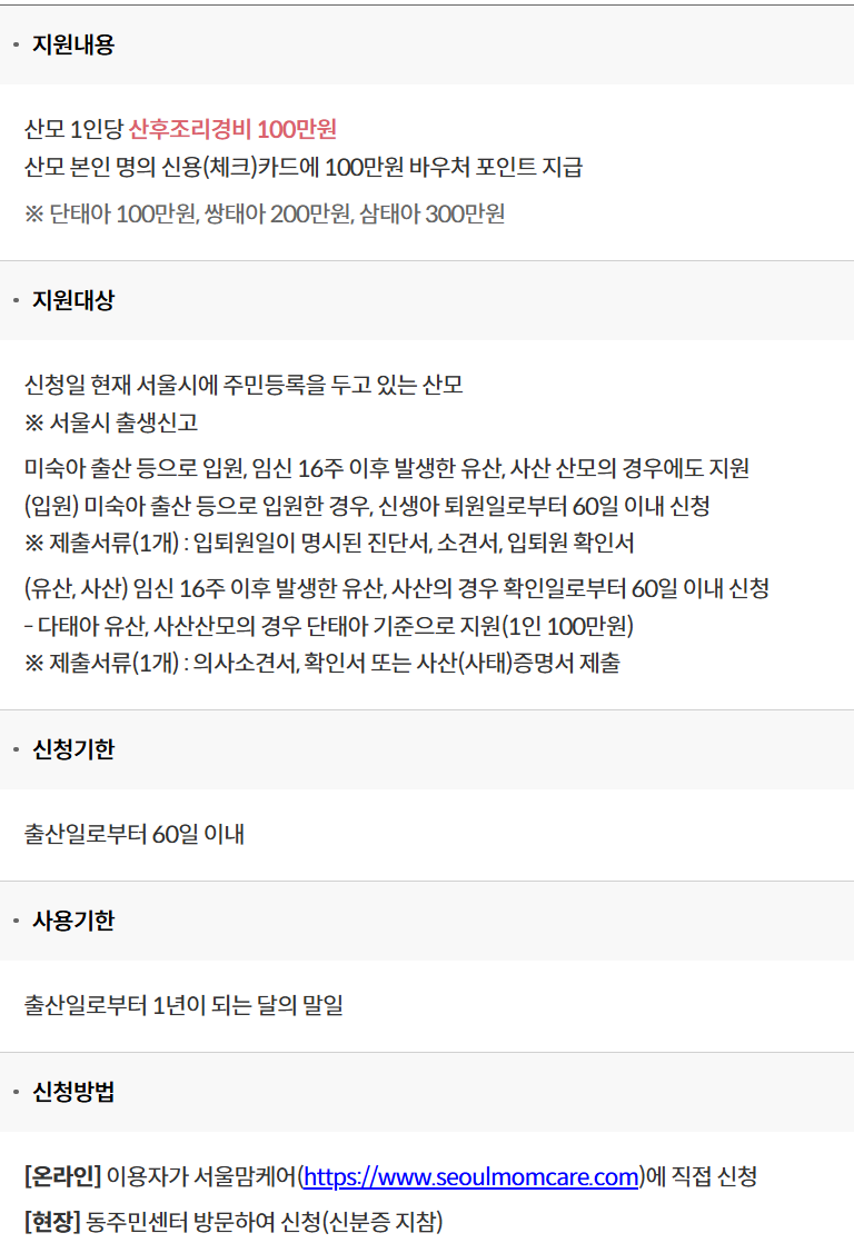 - 다태아 산모는 320만 원 지원 (서울시 추가 170만 원 포함)