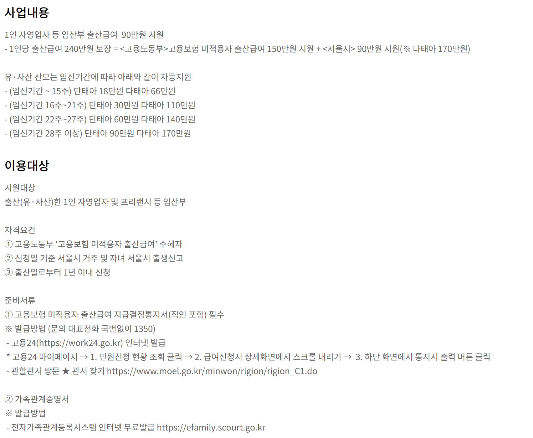 - 자영업자·프리랜서 대상: 240만 원 출산급여 (고용보험 미적용자 + 서울시 90만 원)