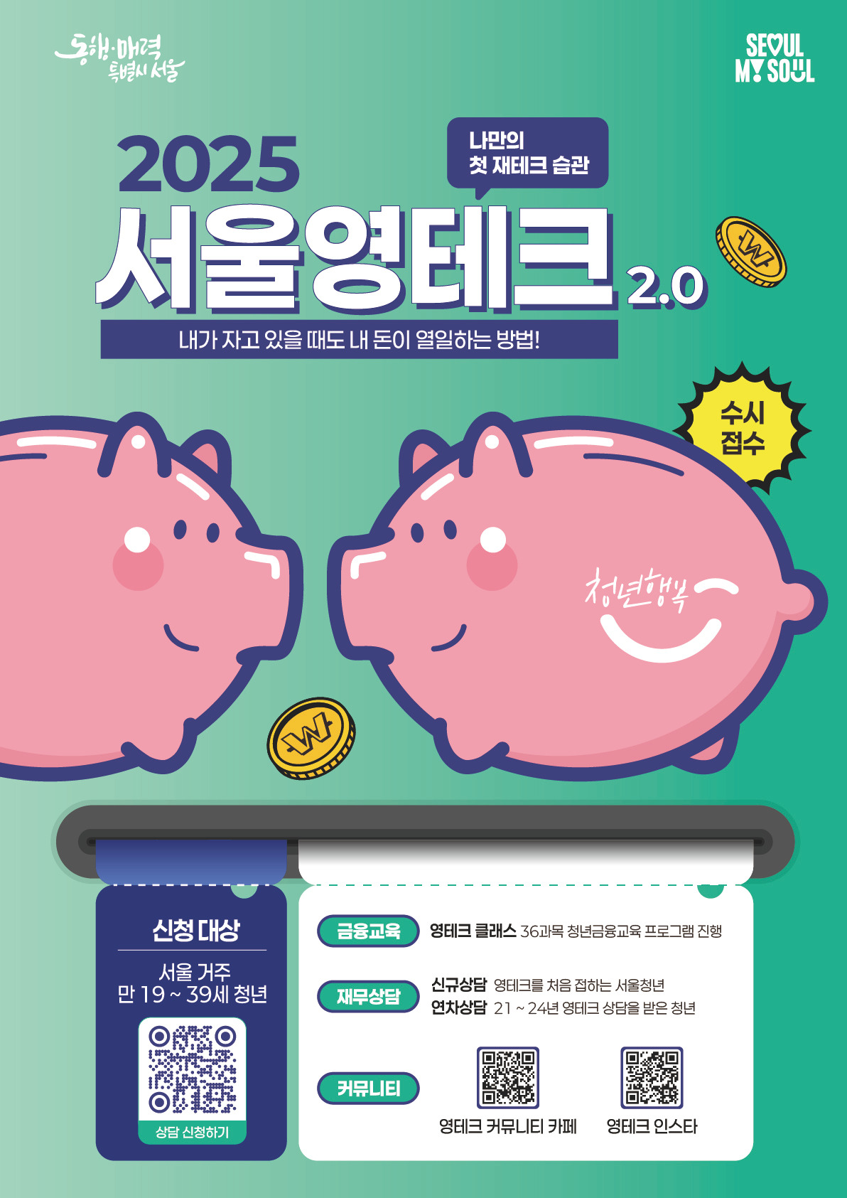 서울시는 자산 형성이 어려운 청년들에게 체계적인 재무상담과 금융교육을 제공하여 경제적 자립을 지원하는 '서울 영테크' 사업을 운영하고 있습니다. 이 프로그램은 만 19세부터 39세까지의 서울 거주 청년을 대상으로 하며, 무료로 제공되는 다양한 재무상담과 금융교육을 통해 청년들의 금융 역량 강화를 목표로 합니다.