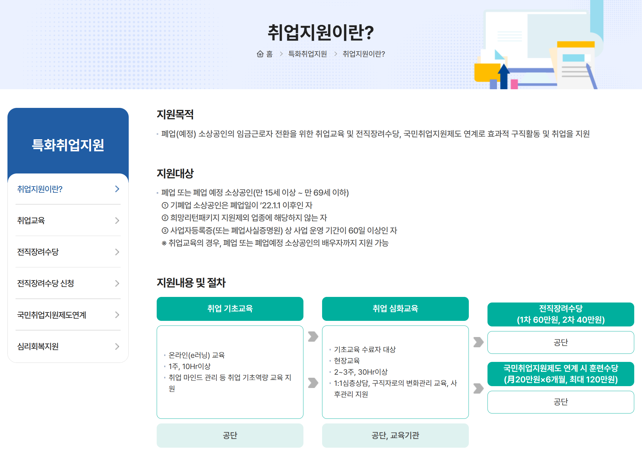 - 전직 장려수당: 폐업 후 취업 성공 시 최대 100만 원 (고용보험 가입 60일 이상).