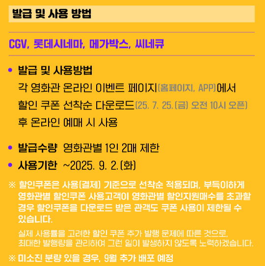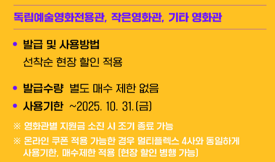- 오프라인 사용처: 온라인 사용 불가 극장 현장 발급 가능