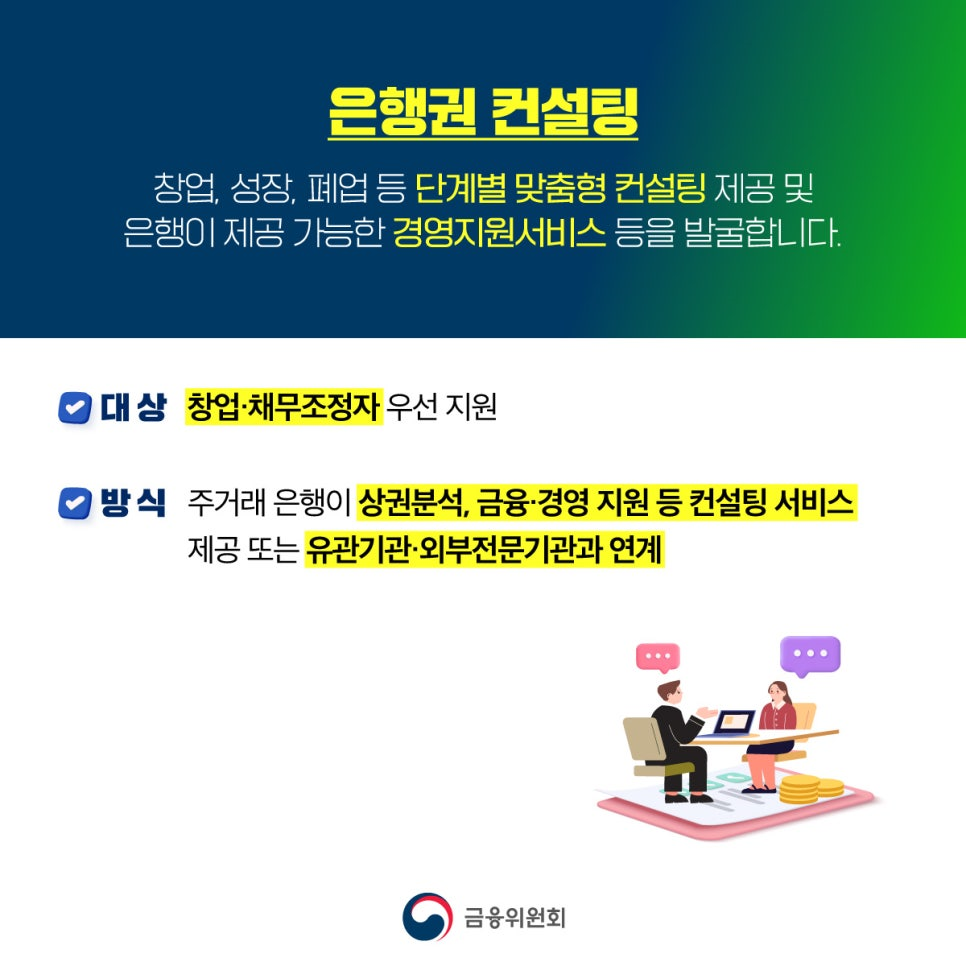 은행연합회와 각 시중은행은 소상공인을 위한 무료 경영 컨설팅 서비스를 제공합니다.