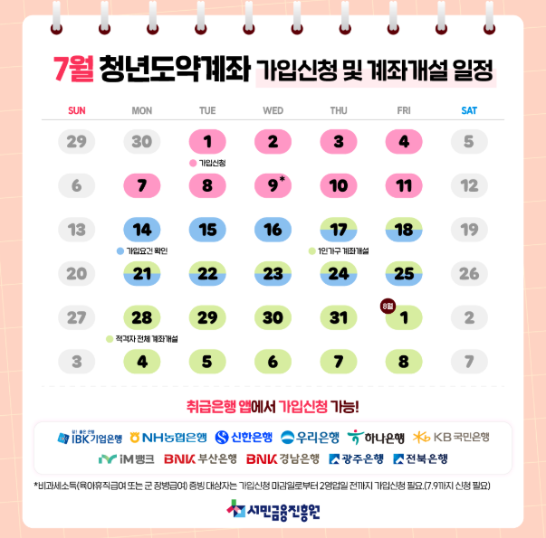 가입 신청은 11개 은행 모바일 앱(국민/신한/하나/우리/농협/기업/경남/광주/전북/부산/대구은행)에서 비대면 신청 가능합니다. 신청 후 가입 자격 확인 절차가 진행되며, 통과 시 계좌 개설 알림을 받게 됩니다.