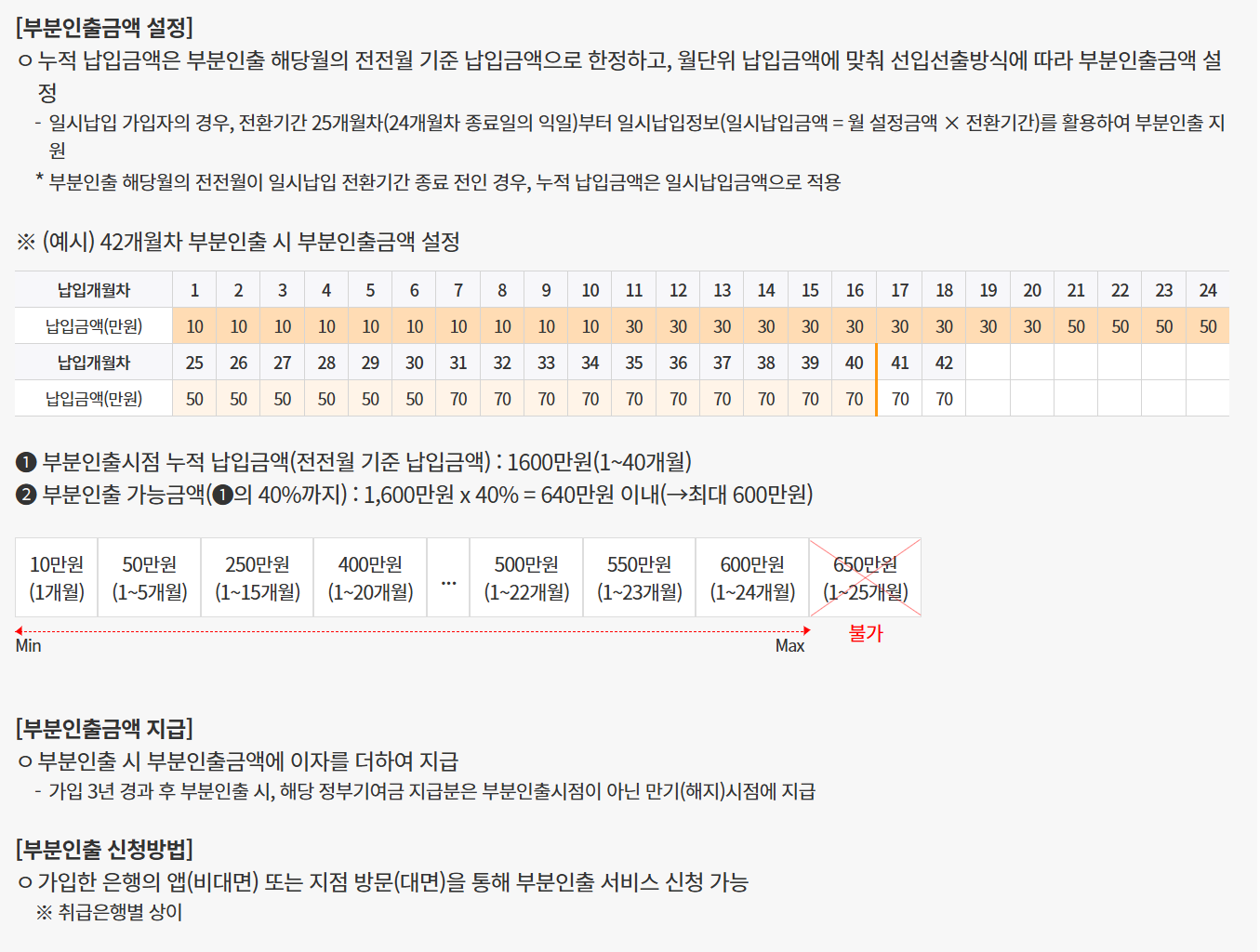 • 부분인출 서비스 이용 가능 (누적 납입 원금의 최대 40% → 인출 시 이자+정부기여금 일부 적용) - 가입 3년 이상 유지 후 중도해지 시