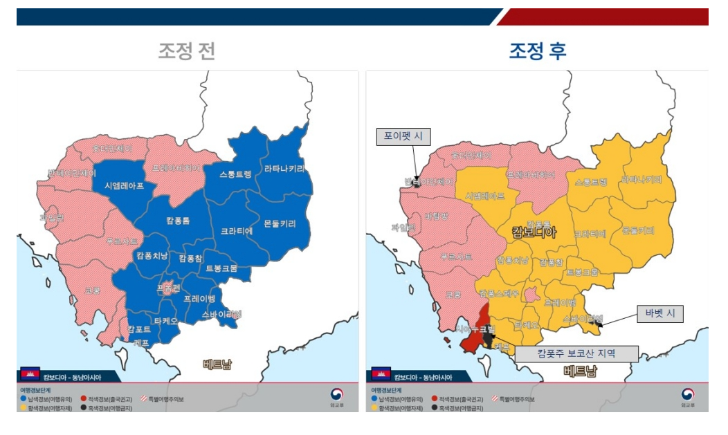 캄보디아 방문 예정이거나 체류 중인 우리 국민들은 외교부 해외안전여행 홈페이지를 통해 최신 여행경보를 반드시 확인해야 합니다. 현재 캄보디아 일부 지역은 **여행금지(4단계)** 및 **특별여행주의보**가 발령된 상태입니다.
