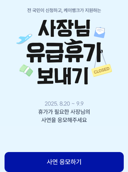 케이뱅크의 사장님 유급휴가 보내기 캠페인은 사연만 있으면 누구나 응모할 수 있고, 당첨 시 사장님께 최대 300만 원 휴가비가 지원됩니다. 기본 안내는 케이뱅크 여행지원금 공식 공지와 케이뱅크 여행지원금 이벤트 페이지에서 확인 가능합니다.