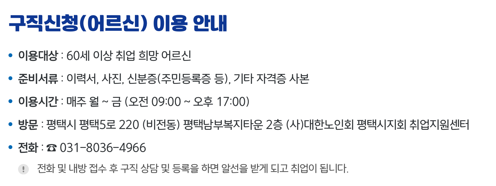 - 주소: 경기도 평택시 평택5로 220 (비전동) 평택남부복지타운 2층 (사)대한노인회 평택시지회 취업지원센터