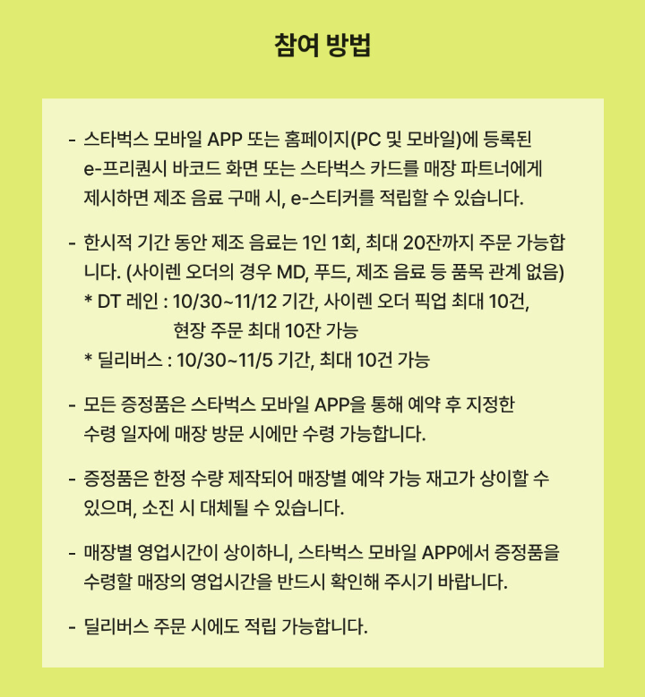 이벤트 참여는 스타벅스 모바일 앱 또는 홈페이지를 통해 e-프리퀀시 바코드 또는 스타벅스 카드 제시 후 제조 음료 구매 시 e-스티커 적립 방식으로 진행됩니다.