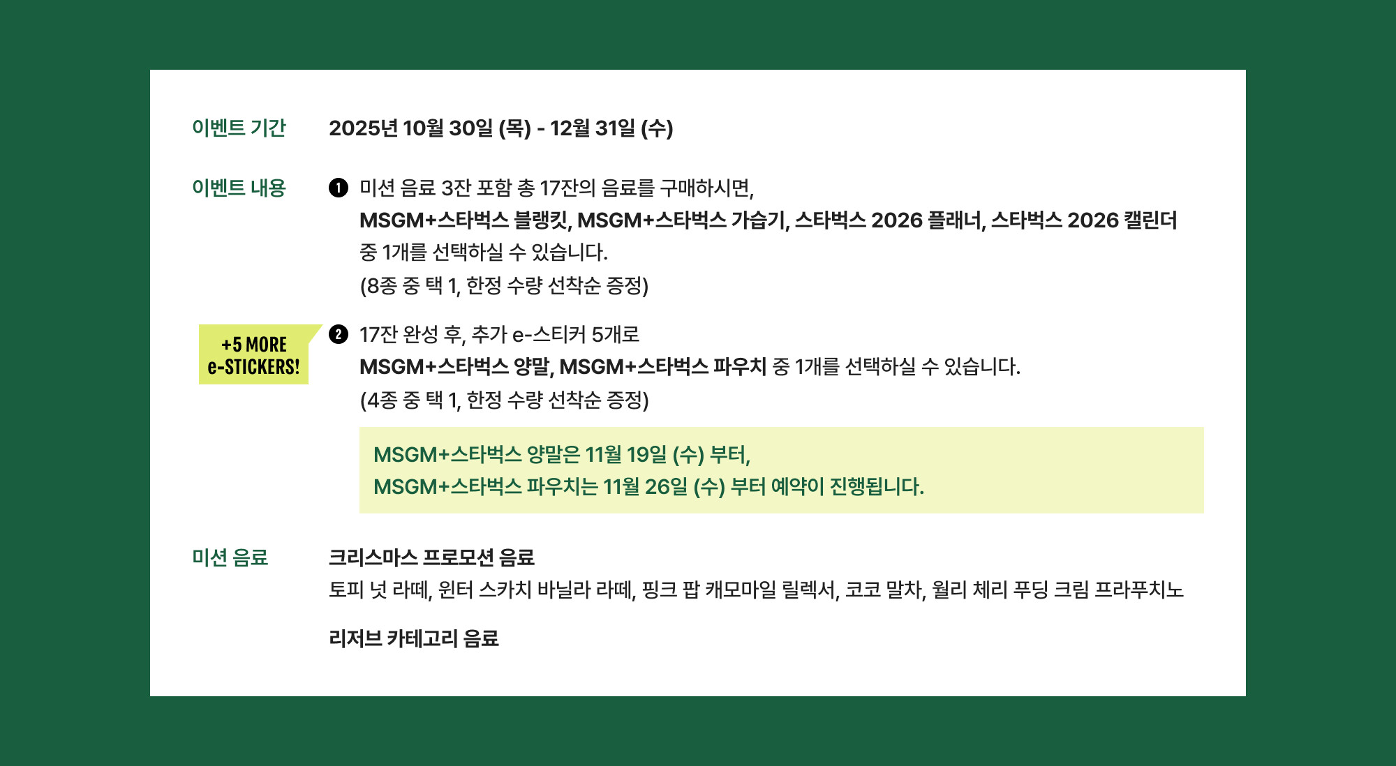 | 참여 조건 | 미션 음료 3잔 포함, 제조 음료 총 17잔 구매 후 e-스티커 적립 완료 시 증정품 예약 가능 |
