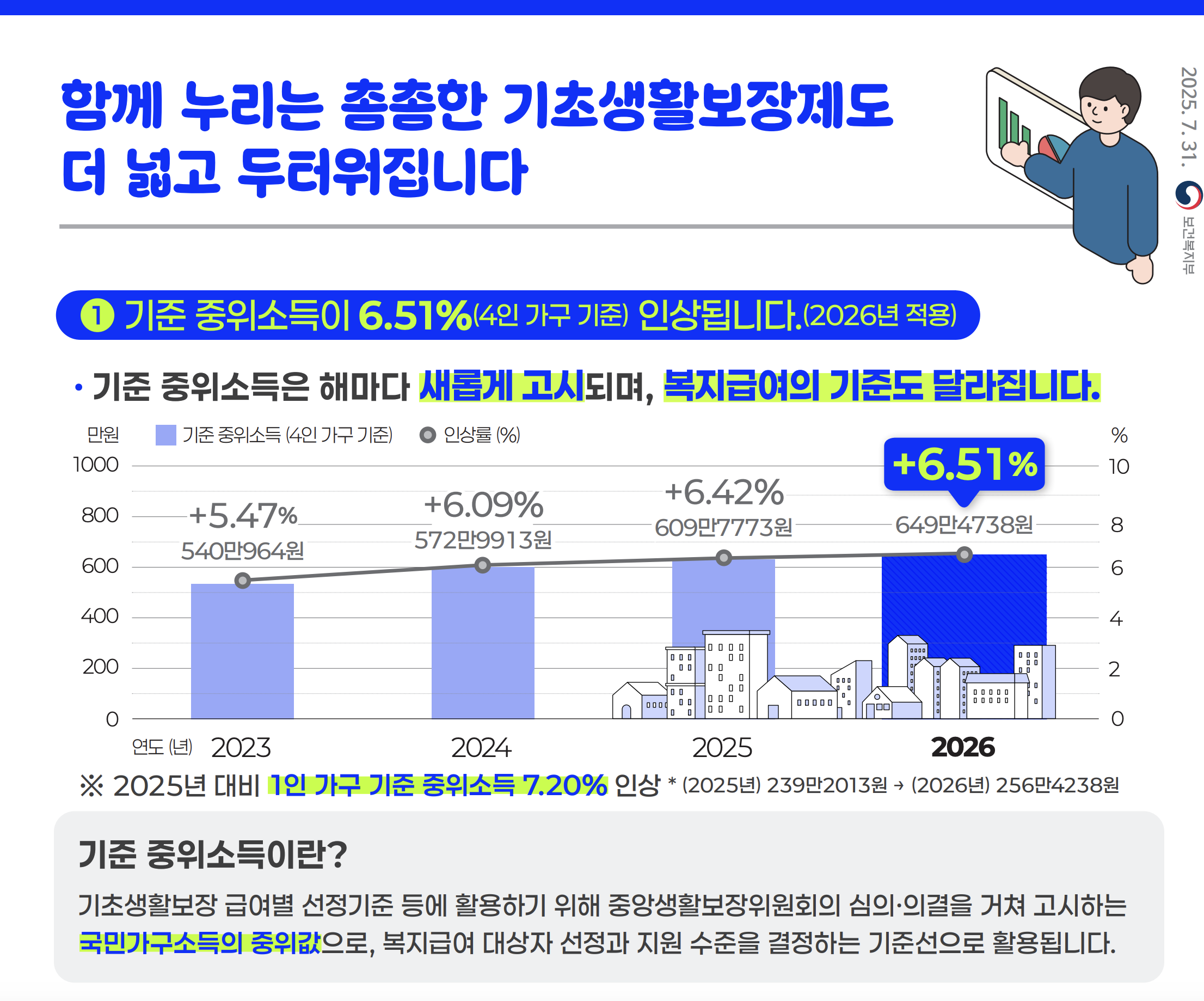 - 기준 중위소득 인상: 4인 가구 기준 609만 7,773원 → 649만 4,738원 (6.51%↑)